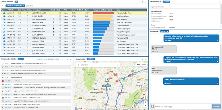 Les écrans de statut montrent en temps réel la position du véhicule, son activité en cours, le nom du conducteur et le temps de conduite restant, le niveau du carburant, etc.